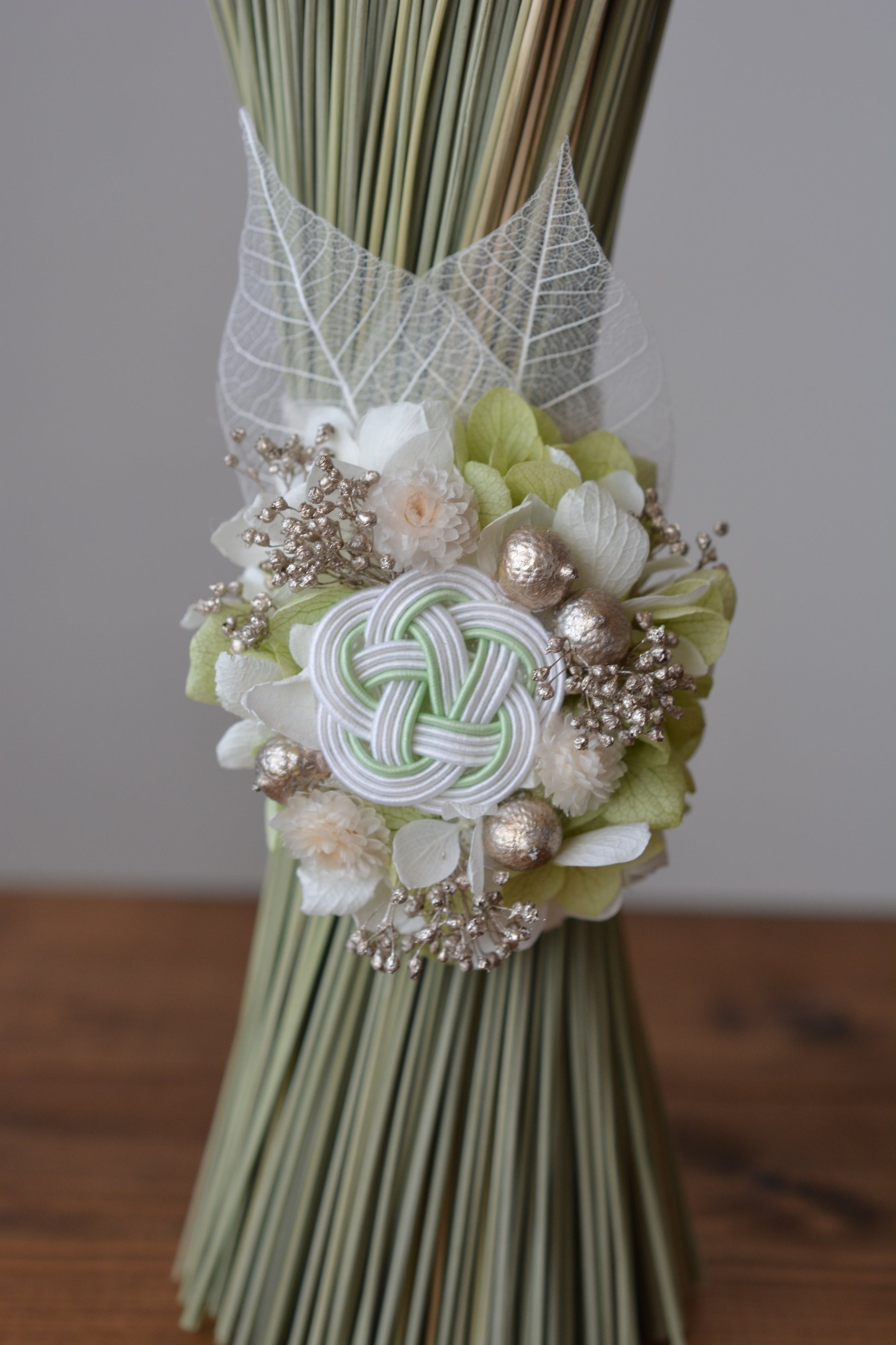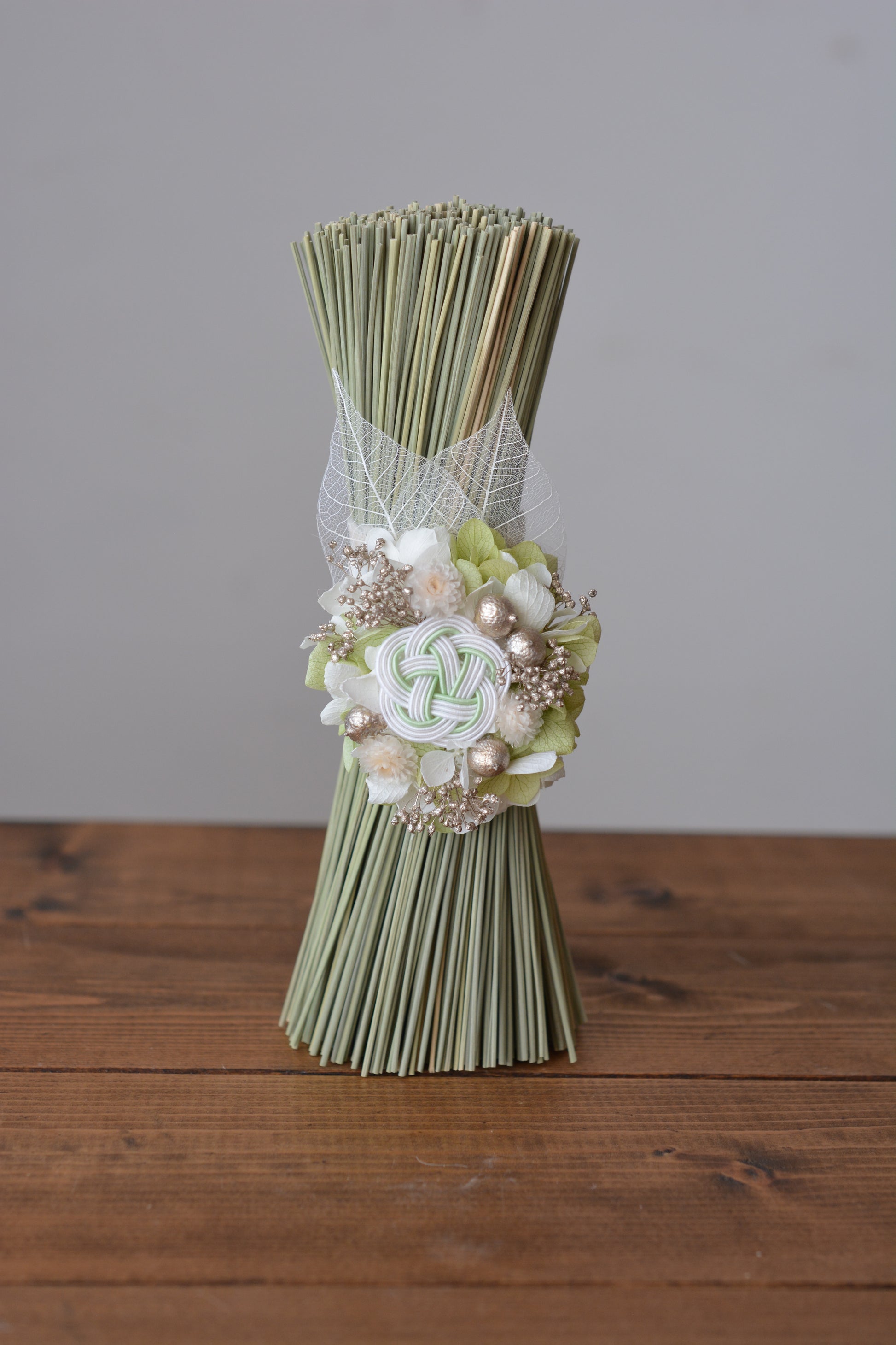 やわらかなグリーンでまとめた、凛とした美しさを感じる藺草のお飾り。自然そのものの穏やかな空気をそのまま閉じ込めたような雰囲気を生み出します。ご自宅用にはもちろん、贈り物としてもおすすめです。