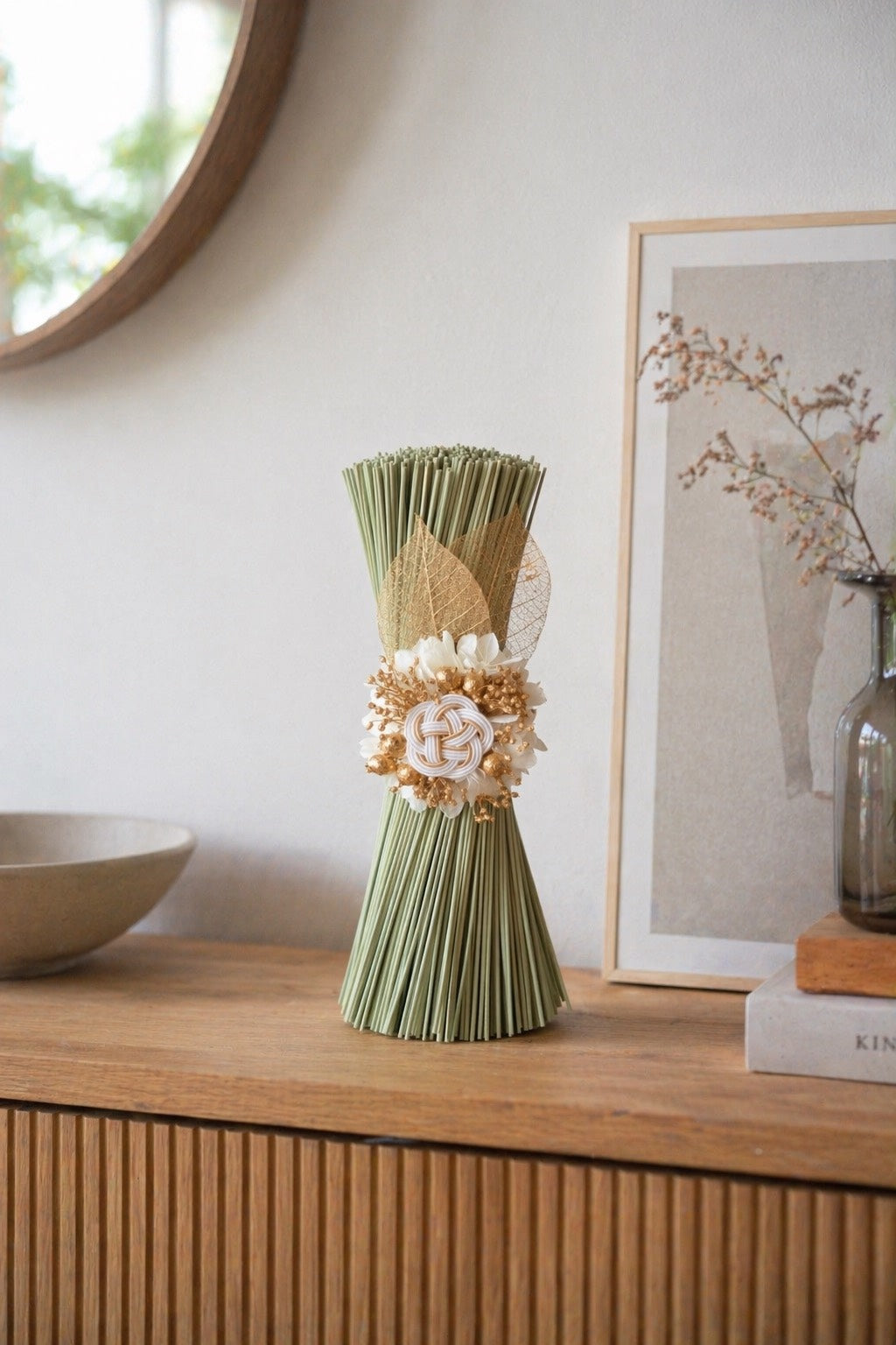 こちらの作品は藺草で仕立てたインテリア作品です。玄関やリビング、寝室などにそっと飾り、空間にやさしい彩をりを添えてくれます。見た目の美しさだけでなく、藺草ならではの自然な香りもお楽しみいただけます。