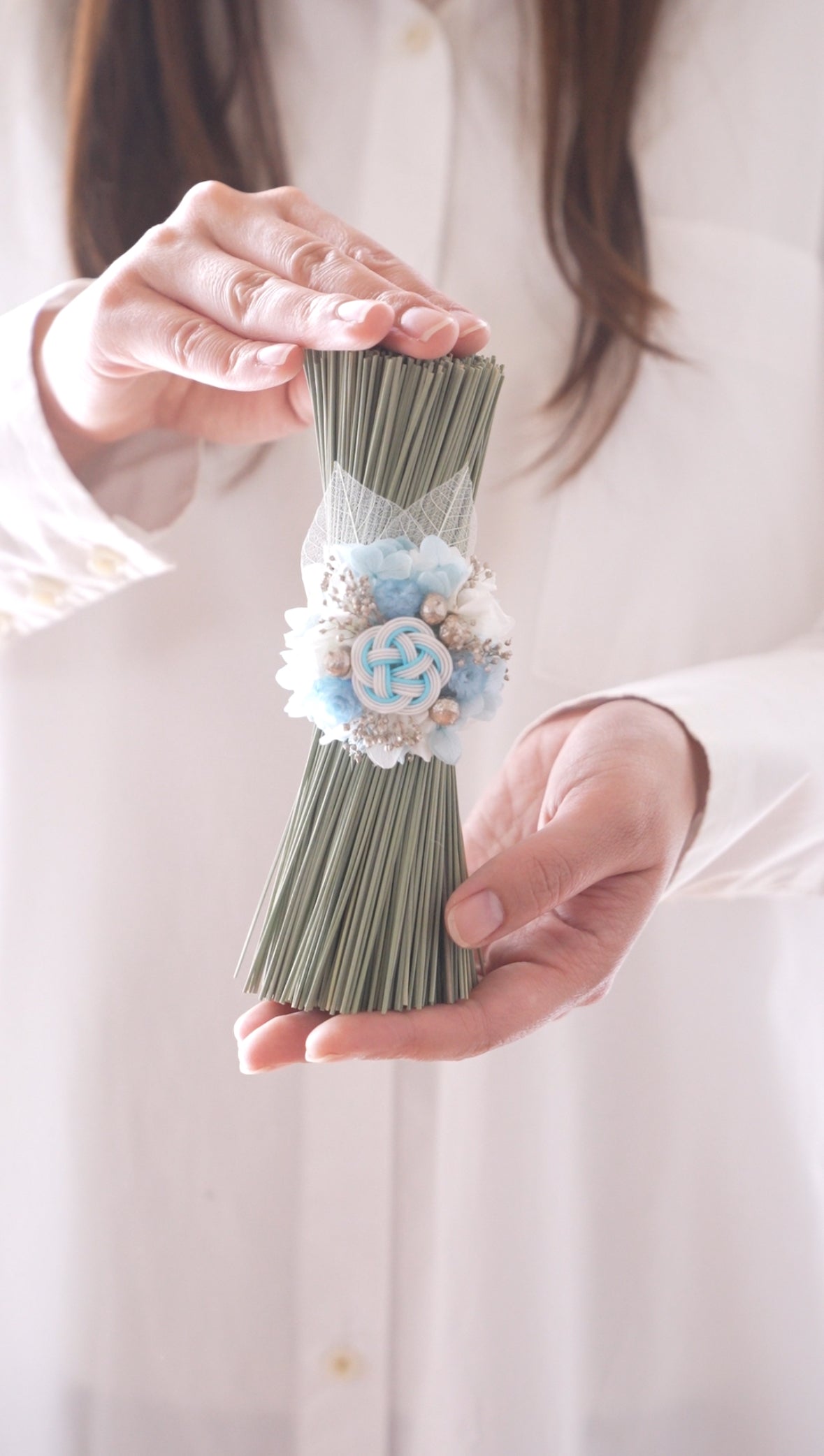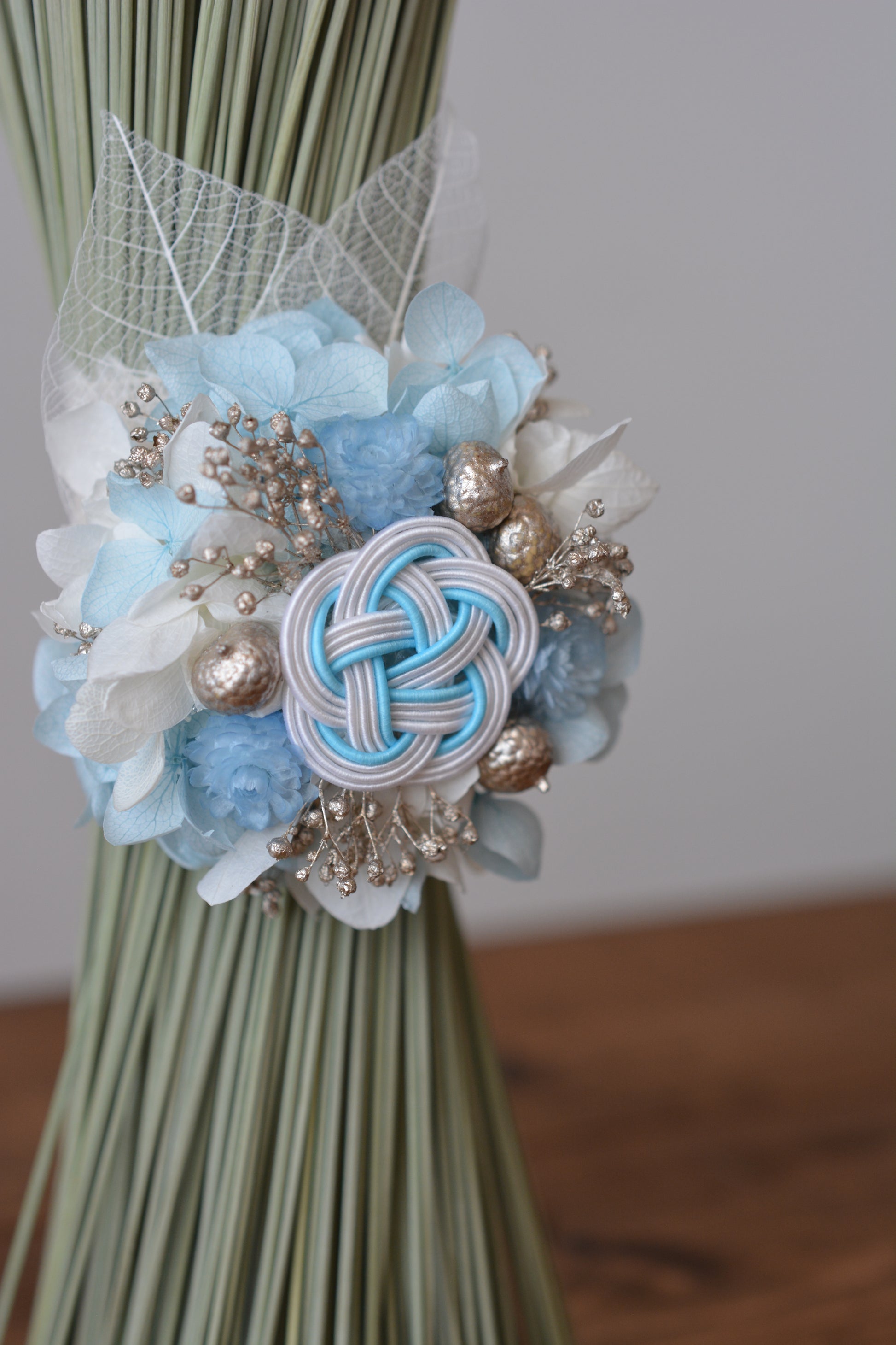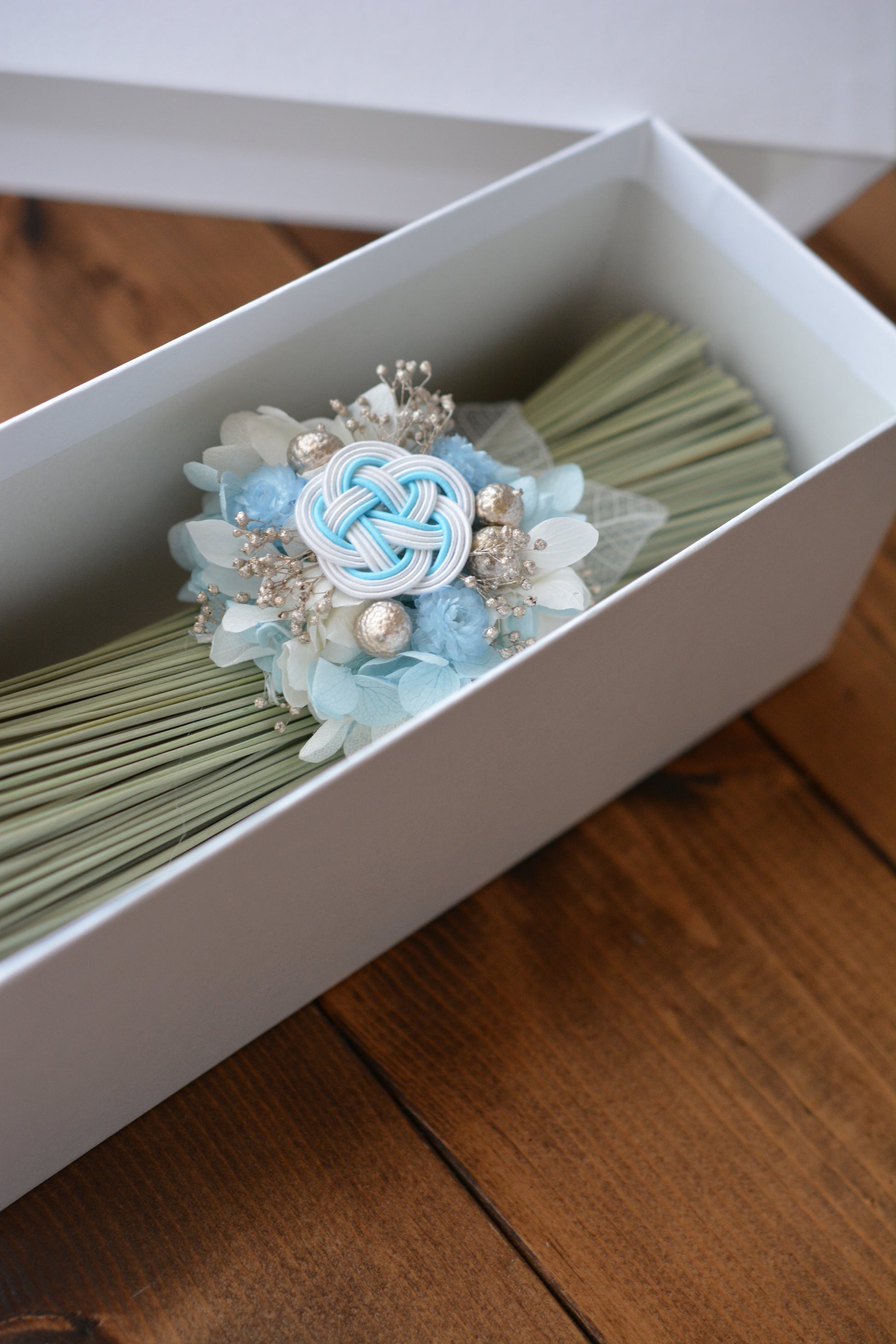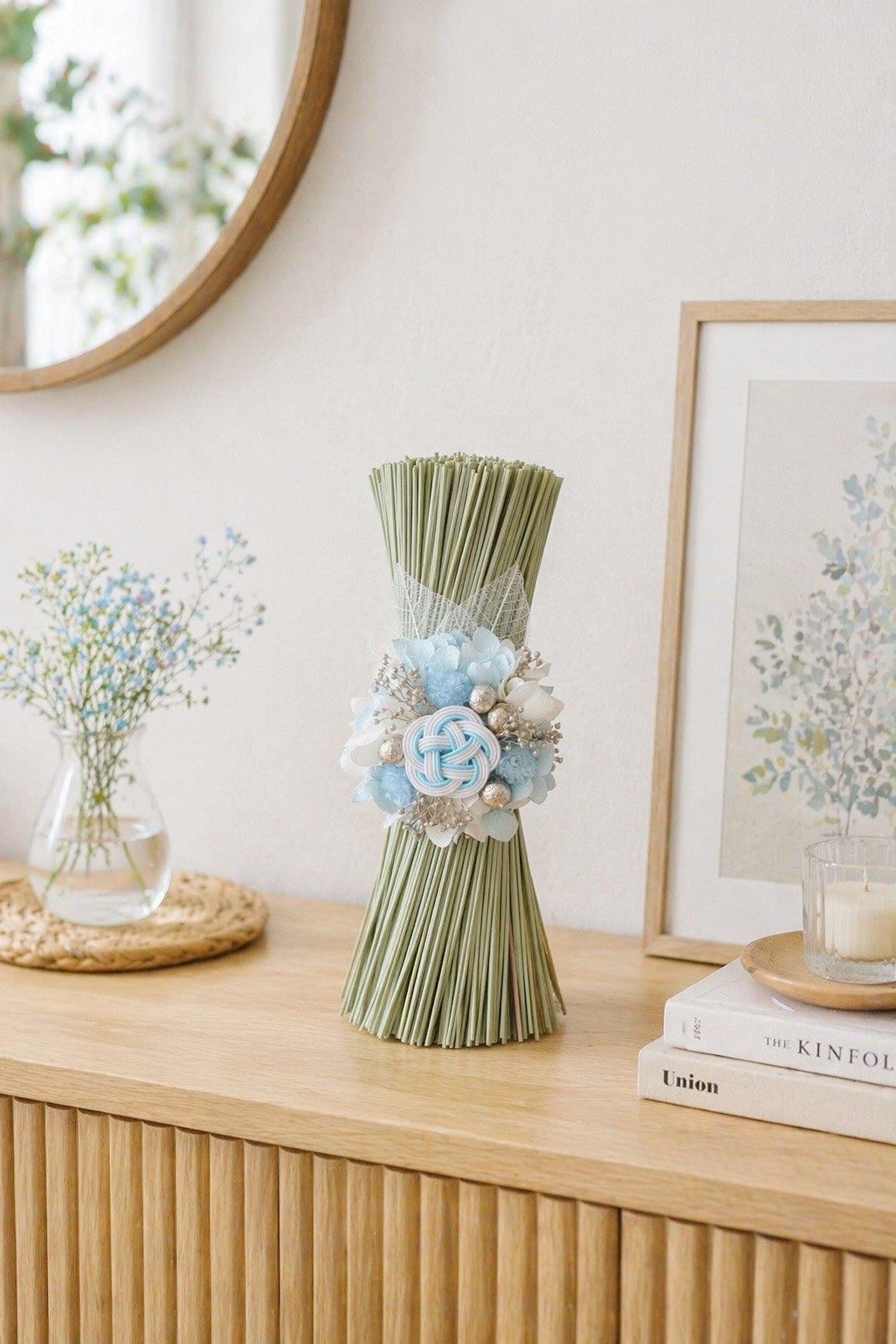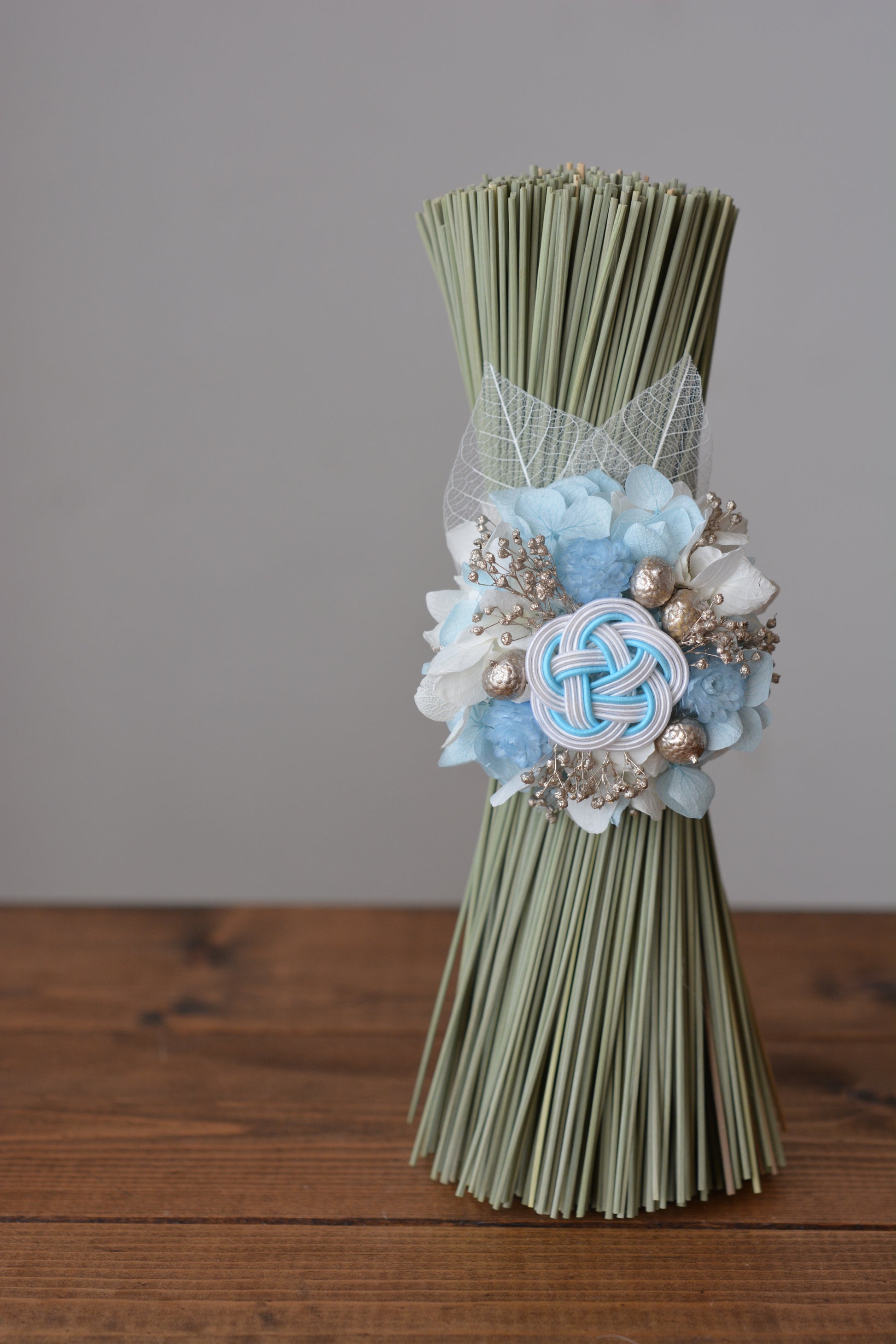 やわらかな水色の水引とお花をあしらった、澄んだ空気を感じる藺草のお飾り。清らかで、どこか凛とした空気感。心を静かに整えてくれるような一品です。ご自宅用にはもちろん、贈り物としてもおすすめです。